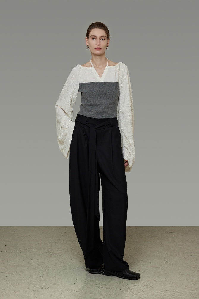 Confidently step into your spotlight with this masterfully tailored top. The flattering V-neckline frames your silhouette, while the unique front tie adapts to your mood. Experience drama with sleeves designed like flowing clouds, adding ethereal movement. Dual-toned panels ensure you make a sophisticated statement that is both dynamic and timelessly chic.