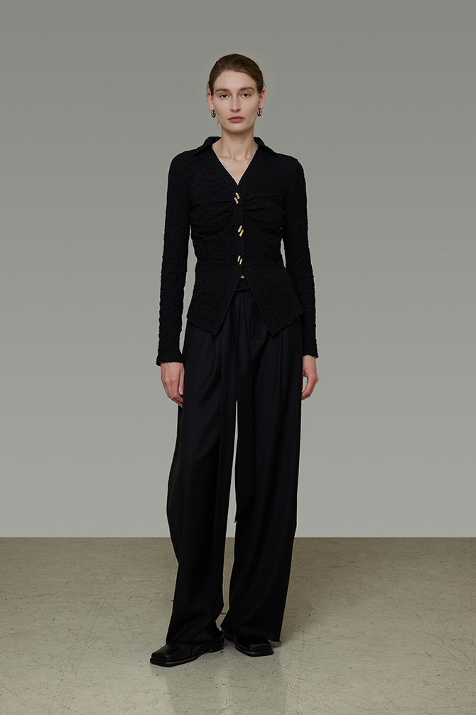 Effortlessly transition from boardroom brilliance to evening allure in this stunning top. Featuring a capable lapel merging into a flattering V-neck that showcases your collarbones, accented by striking gold buttons and front pleats. The precision slim fit sculpts your silhouette, highlighting your waist for superior proportions. Confidently elegant, this piece is your key to sophisticated style, day or night.