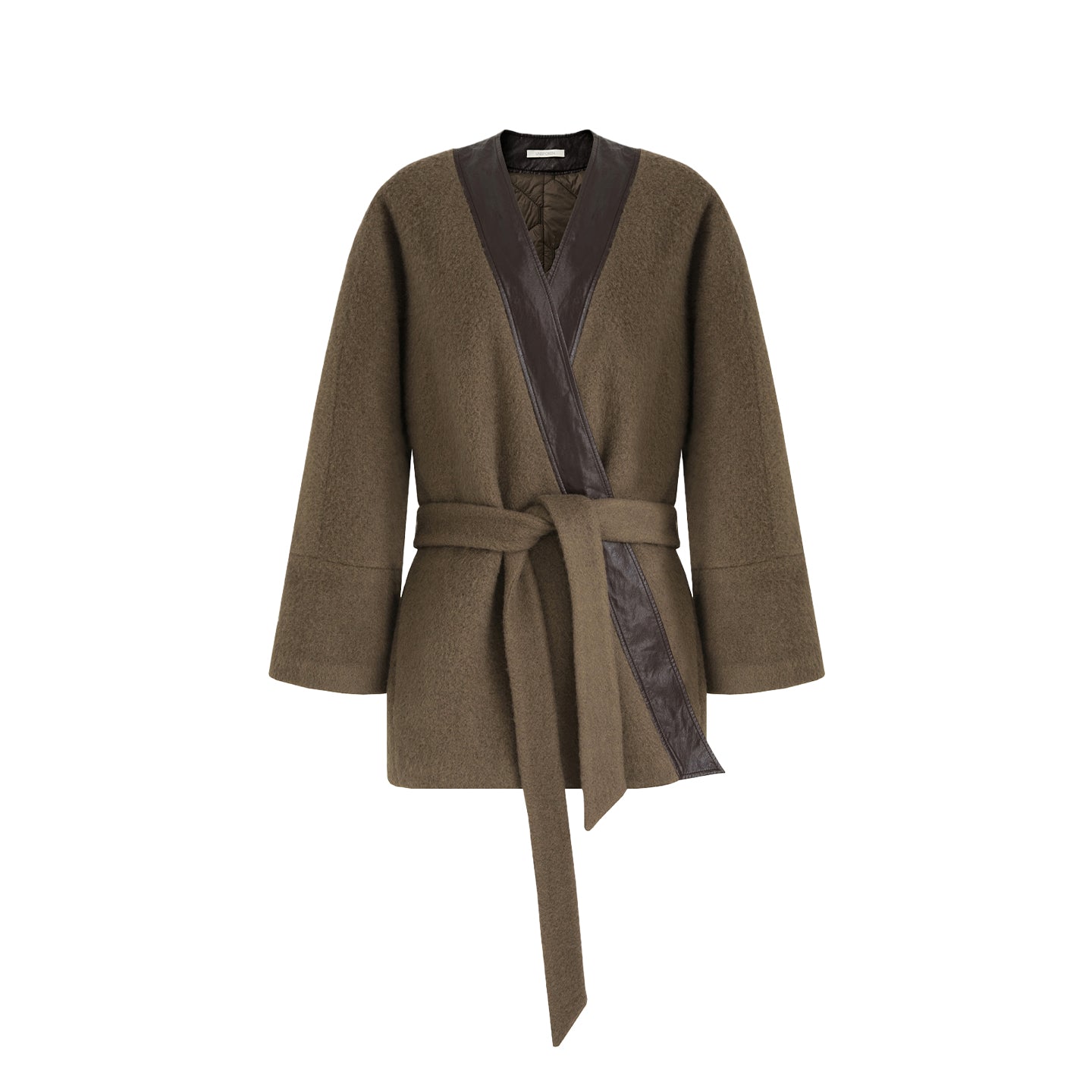 Command attention in this effortlessly chic coat, featuring a unique V-neck juxtaposed with rich leather splicing for a modern-retro edge. The adjustable waist tie lets you sculpt your silhouette—languid and relaxed or cinched for definition. Embrace the powerful, oversized drape that radiates confident, easy elegance this season.