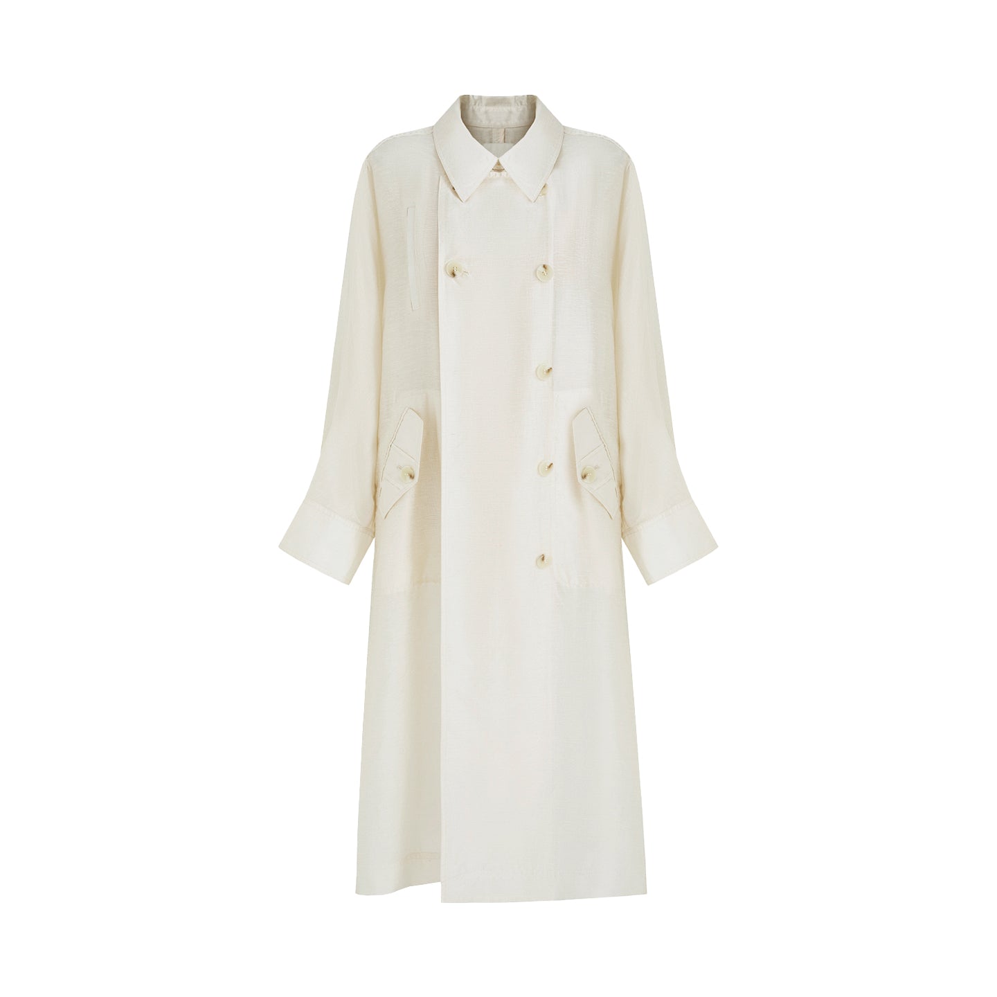 Confidently step into structured serenity with this long trench coat. Its sharp silhouette drapes like an architectural curtain, featuring a crisp lapel and rhythmic double-breasted front. Experience effortless composure with the relaxed, wide shoulder line and subtly gathered cuffs, balancing hard structure with soft flow for sophisticated, poetic style.
