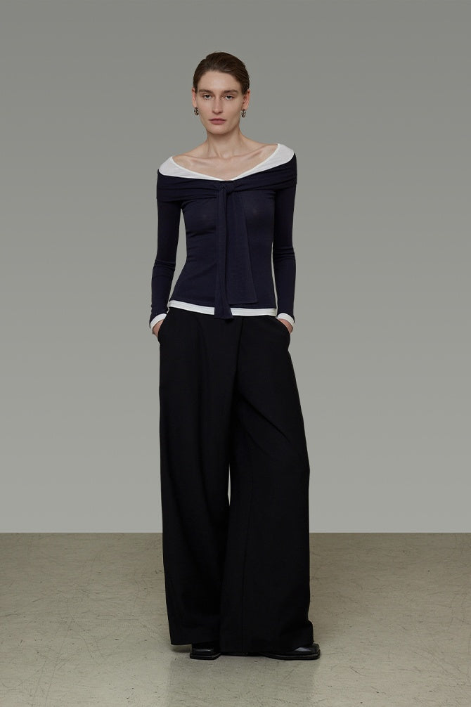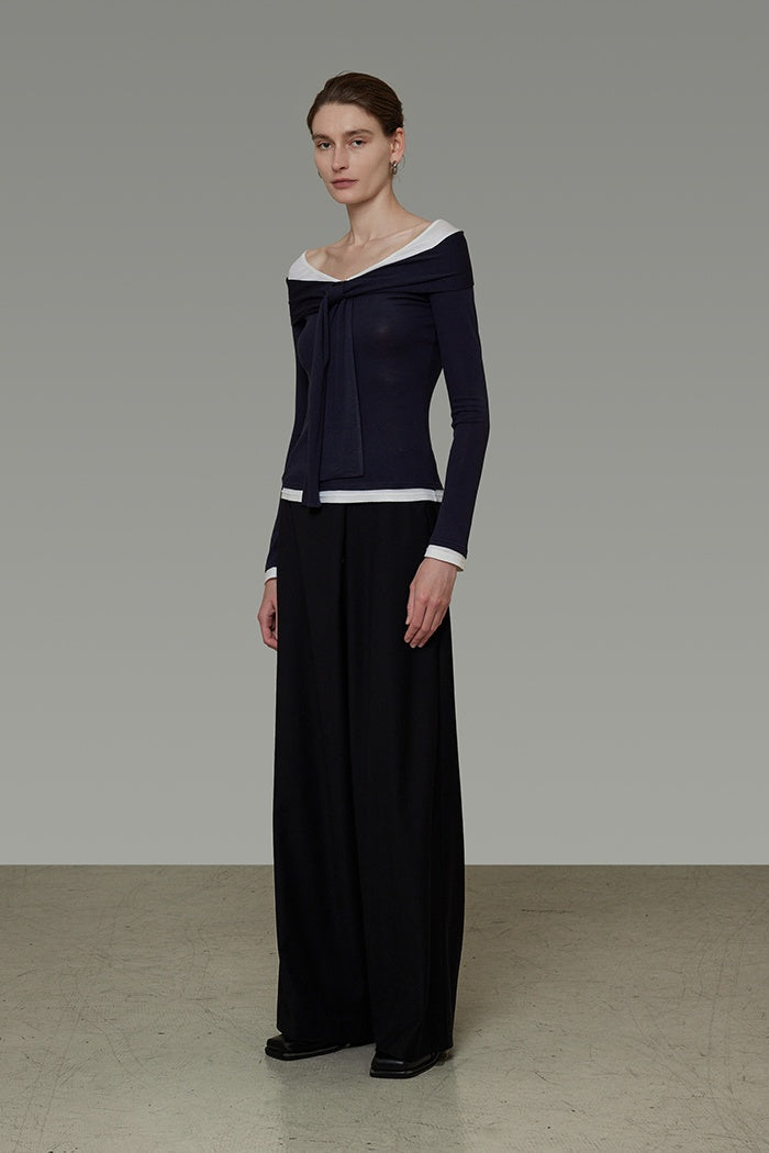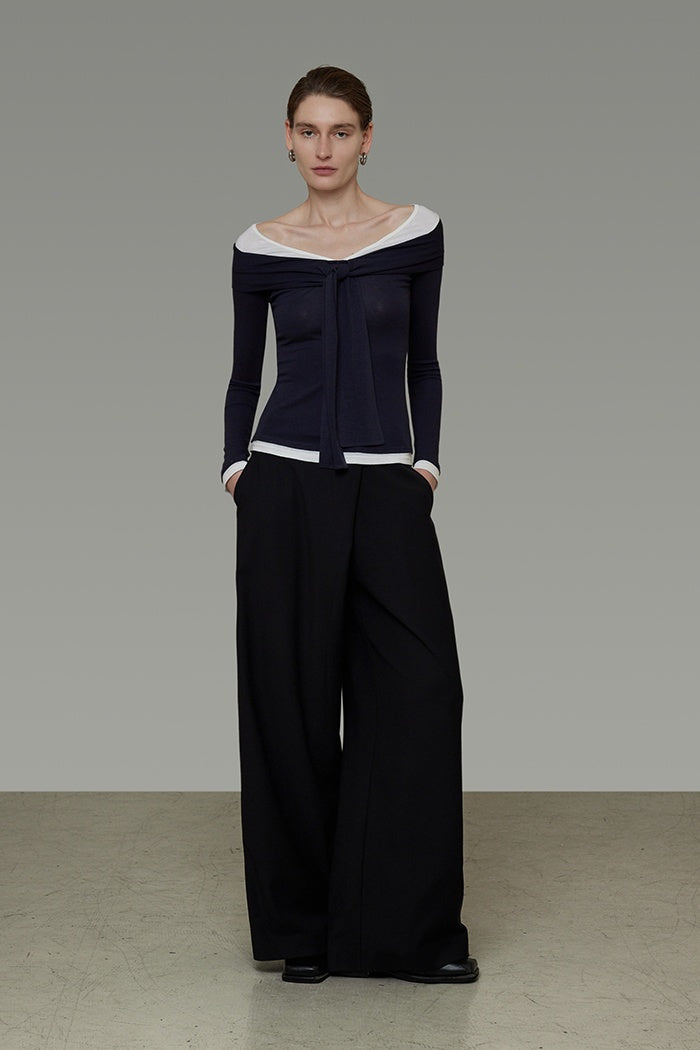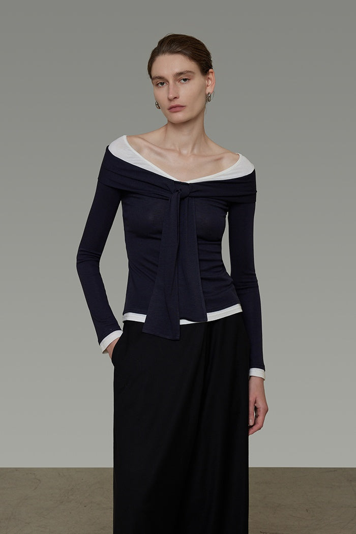 Effortlessly command attention in this cleverly designed faux two-piece top. The daring off-the-shoulder cut highlights elegant collarbones, while the slim fit sculpts your curves beautifully. Featuring refined tie accents and a striking navy/white contrast, this piece ensures you look taller and sophisticated.