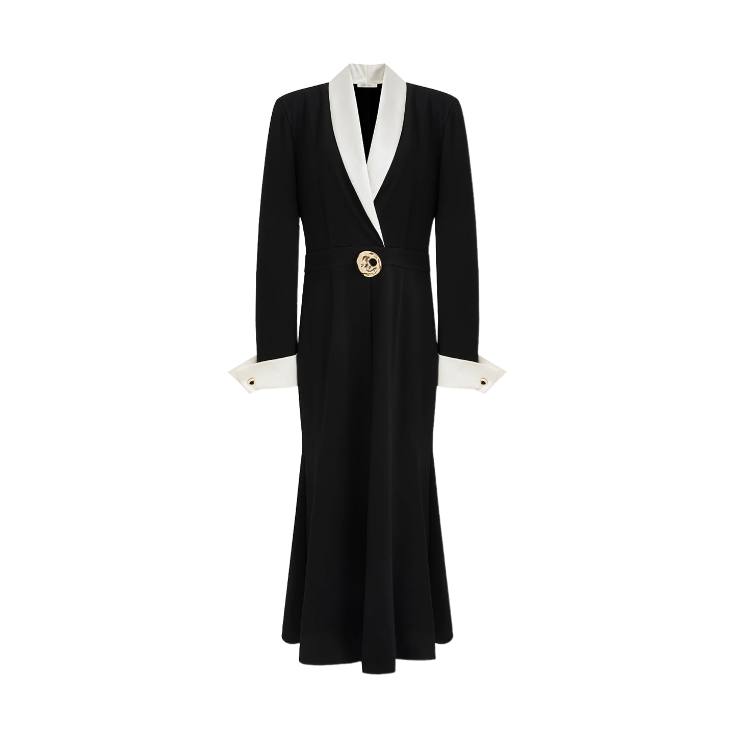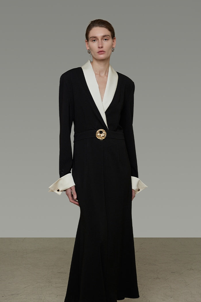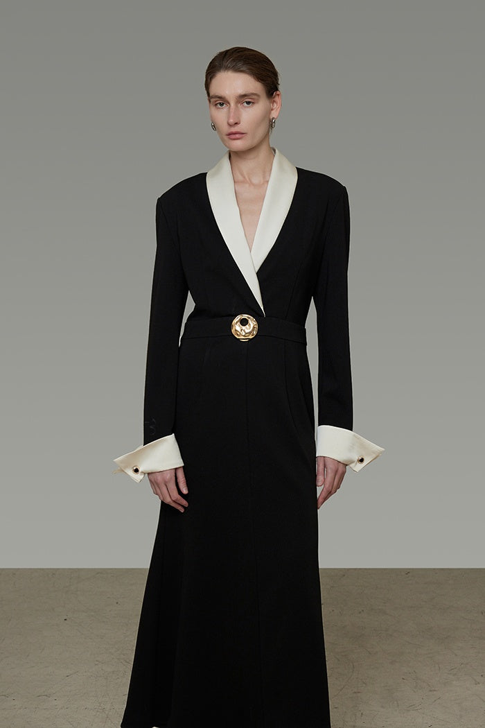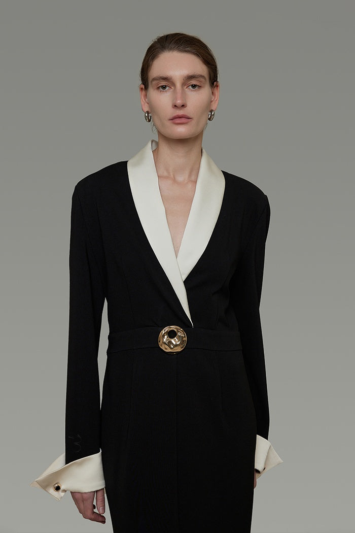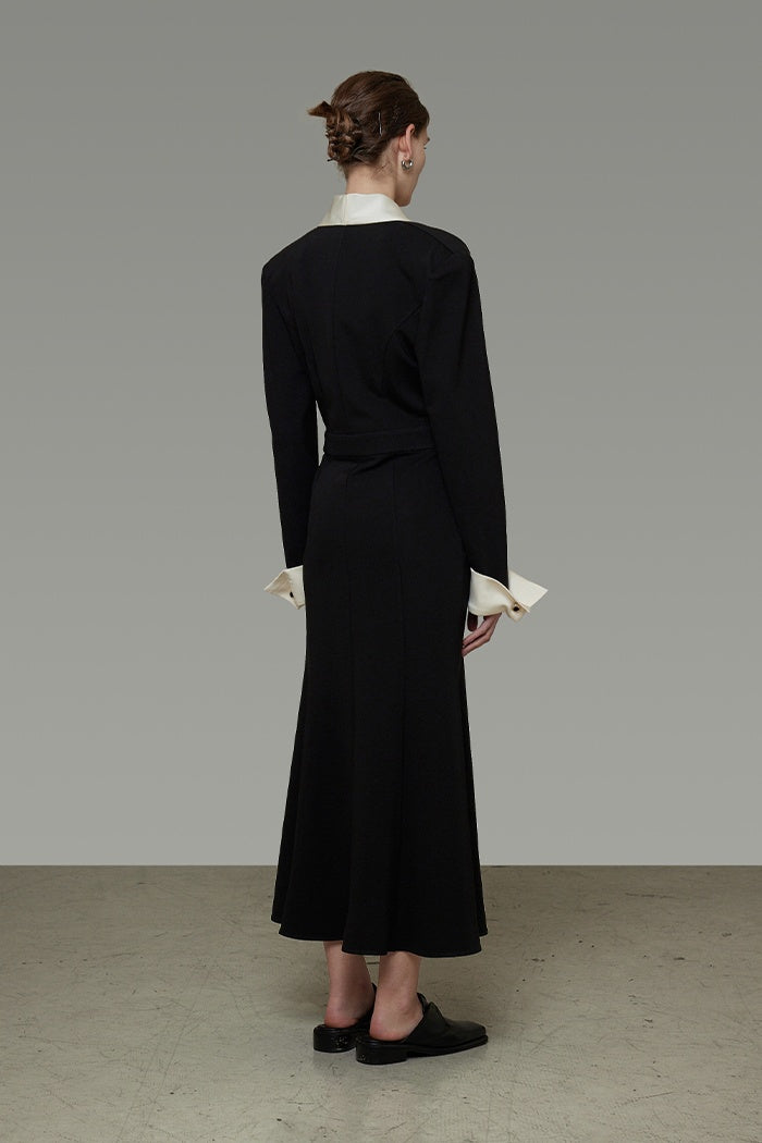 Effortlessly embrace architectural elegance in this impeccably tailored dress. Designed to honor your curves with fluid lines and comfortable refinement, the satin splice adds a whisper of light to the classic black. Confidently embody sophisticated artistry where Eastern subtlety meets sharp Western structure.