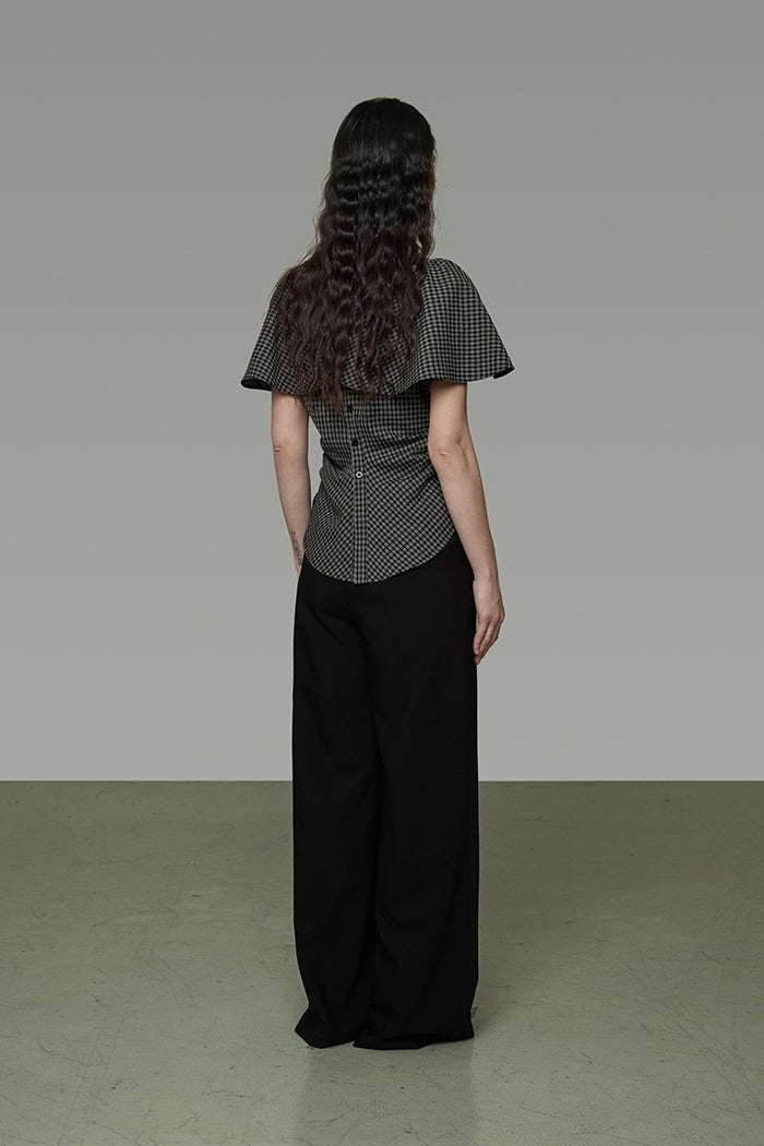 Command effortless elegance in this timelessly sophisticated plaid blouse. Featuring a romantic ruffled neckline and chic off-the-shoulder cut, it sculpts your collarbone beautifully. Subtle waist ruching ensures a perfectly relaxed yet figure-skimming fit, finished with exquisite shell buttons. Confidently embrace versatile, chic style.